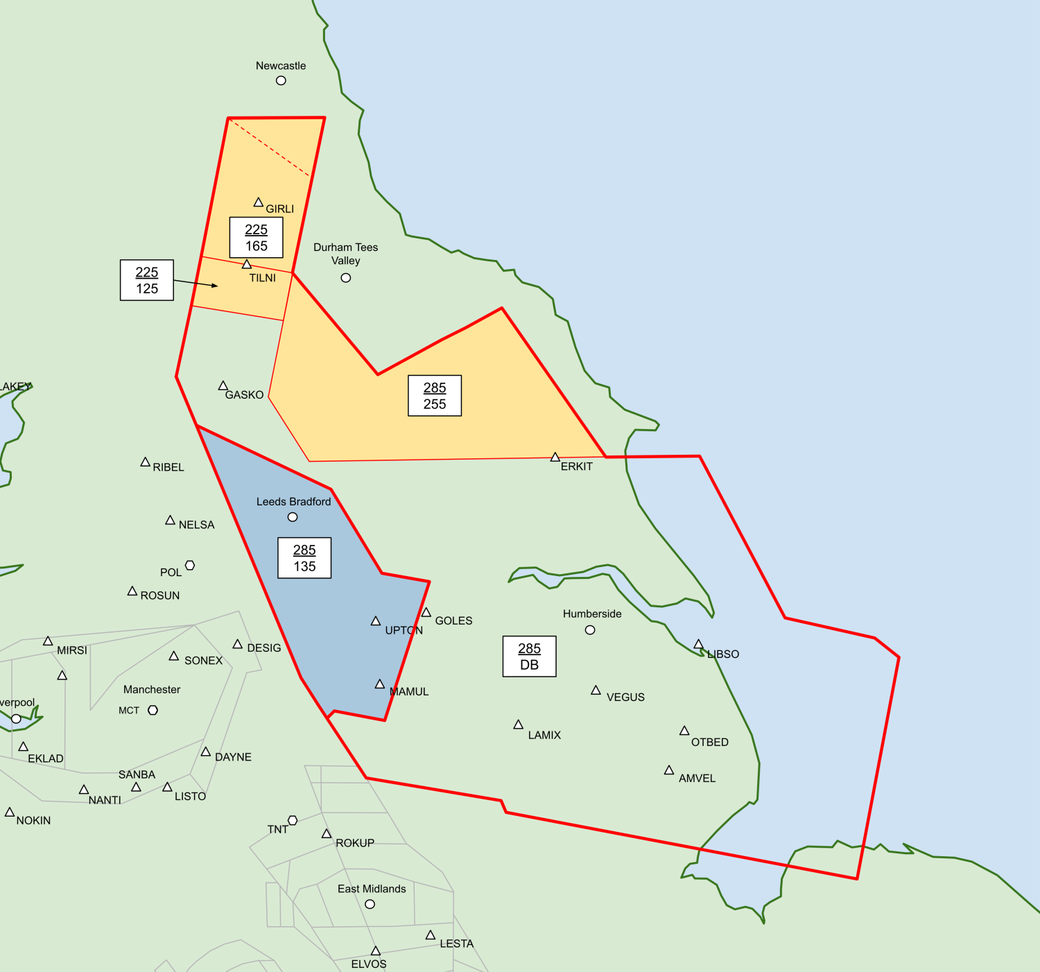 2. Valid 27 November 2025 For the Manchester Staff-Up, a temporary arrangement is made to allow for the opening of PC North only. Since the position uses a non-standard callsign (MAN-N_CTR), it will not be recognised by VATSIM online maps and as such, EGNM traffic may need to be directed to the correct frequency when it is open. Any errors in procedures should be reported to the Operations department via the Helpdesk or Discord. Positions This temporary instruction permits the opening of MAN-N_CTR, only when MAN_E_CTR is also online. When it is open, the Northeast sector is split between the two controllers: the real world PC North sector is owned by MAN-N_CTR on 135.715 (see Figure 1), and the PC East sector is owned by MAN_E_CTR on 133.8 with a reduced Area of Responsibility (see Figure 2). Both MAN-N_CTR and MAN_NE_CTR use the same frequency, and so must not be opened at the same time. PC East - MAN_E_CTR (Relief: MAN_E__CTR) Frequency: 133.800 MHz RTF callsign: Scottish Control Coordination callsign: PC East PC East has top-down responsibility for both PC Northeast and PC Southeast. If PC North only is opened (MAN-N_CTR 135.715), then MAN_E_CTR becomes responsible for the remaining part of the PC Northeast sector. PC Northeast - MAN_NE_CTR (Relief: MAN_NE__CTR) Frequency: 135.715 MHz RTF callsign: Scottish Control Coordination callsign: PC Northeast Top-down responsibility for: EGNM, EGNJ, EGNT, EGNV PC North only - MAN-N_CTR (Relief: MAN-N__CTR) Frequency: 135.715 MHz RTF callsign: Scottish Control Coordination callsign: PC North Top-down responsibility for: EGNM only Notes: 1) The dash (-) in 'MAN-N' is required to enable correct sector ownership. 2) This position cannot be opened at the same time as MAN_NE_CTR as they share the same frequency. 3) MAN-N_CTR will not be recognised by VATSIM online maps and as such, EGNM traffic may need to be directed to the correct frequency when it is open. 🗺️ Agreed Levels Diagram - none, see agreements below Standing Agreements Between PC East and PC North Traffic following the standing agreements is RFT and RFC/D as per typical standing agreement procedures. From PC East to PC North To Agreement Conditions EGCC, EGNH, EGNO FL170 lvl GOLES Positioned on a heading on the north side of L975 EGGP, EGNR FL170 lvl UPTON Positioned on a heading on the north side of L975 EGNM Descending FL140 On a heading towards GOLES MTMA, EGNH, EGNO FL170 lvl BEGAM Positioned on the west side of P18 From PC North to PC East From Agreement Conditions MTMA, EGNH, EGNO Climbing FL160 Positioned south of DESIG-MAMUL or east of P18 centreline EGNM Climbing FL130 Positioned towards the south side of L603/L60 Other Sectors Other standing agreements into/out of the PC North sector are as per the PC East ALD. Aircraft inbound to EGGP/EGNR from the northeast Controllers should be aware that there is no standing agreement for EGGP or EGNR inbounds via GASKO/POL/GOLES between PC North and PC West. A level must be individually coordinated between the controllers responsible for these sectors, as it would need to be without this event split. Coordination with Adjacent Units Adjacent Sectors/ACCs When PC North is opened with the non-standard callsign, it is the responsibility of the controller (or PC Coordinator) to inform the relevant adjacent units/ACCs: Scottish ACC - Talla/Galloway PC Southeast PC West Airfields Whenever PC North is opened with the non-standard callsign of MAN-N_CTR, APC and ADC units at affected airfields shall be informed. Manchester Departures with altered handoff orders: POL/DESIG (05s): PC North only (135.715) > PC Northeast (135.715) > PC East... POL/SONEX (23s): PC North only (135.715) > PC Northeast (135.715) > PC East... PC North is the controller responsible for arriving traffic via ROSUN. Leeds PC North is the controller adjacent to Leeds ATC. As such, whenever PC North is open, all coordination/handoffs for departures and arrivals shall be with PC North (MAN-N_CTR). Newcastle, Teesside, Humberside Unlike when 135.715 is used for the MAN_NE_CTR callsign, the PC North only position using MAN-N_CTR does not cover these airfields top-down. Therefore, coordination is with whichever controller is with the controller covering MAN_E_CTR. Sectors The area in blue is delegated to PC North and is not reflected in the sector file ownership. Figure 1 - PC North only - Area of Responsibility Figure 2 - PC Northeast (minus PC North) - Area of Responsibility